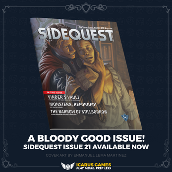 SIDEQUEST is a love letter to the gaming 'zines of old, and is packed with 5e compatible content to inspire you. Whether you are a game master or player you'll find something to use within the pages of SIDEQUEST.
