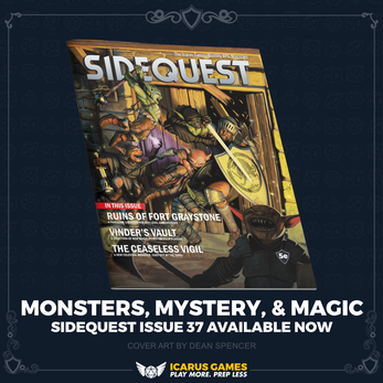 SIDEQUEST is a love letter to the gaming 'zines of old, and is packed with 5e compatible content to inspire you. Whether you are a game master or player you'll find something to use within the pages of SIDEQUEST.