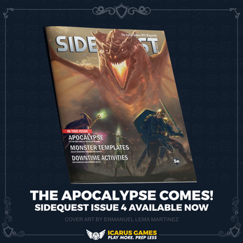 SIDEQUEST is a love letter to the gaming 'zines of old, and is packed with 5e compatible content to inspire you. Whether you are a game master or player you'll find something to use within the pages of SIDEQUEST.